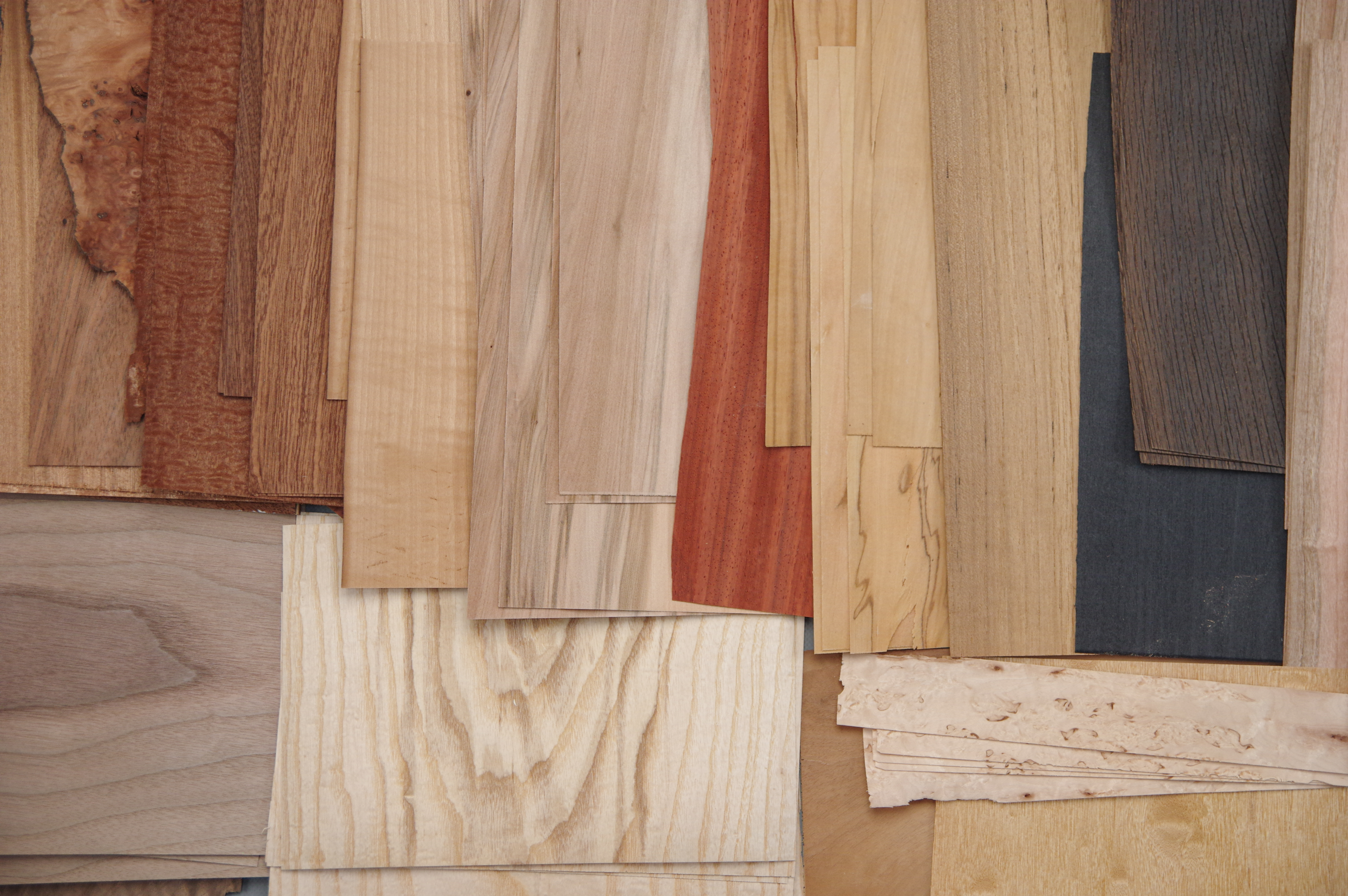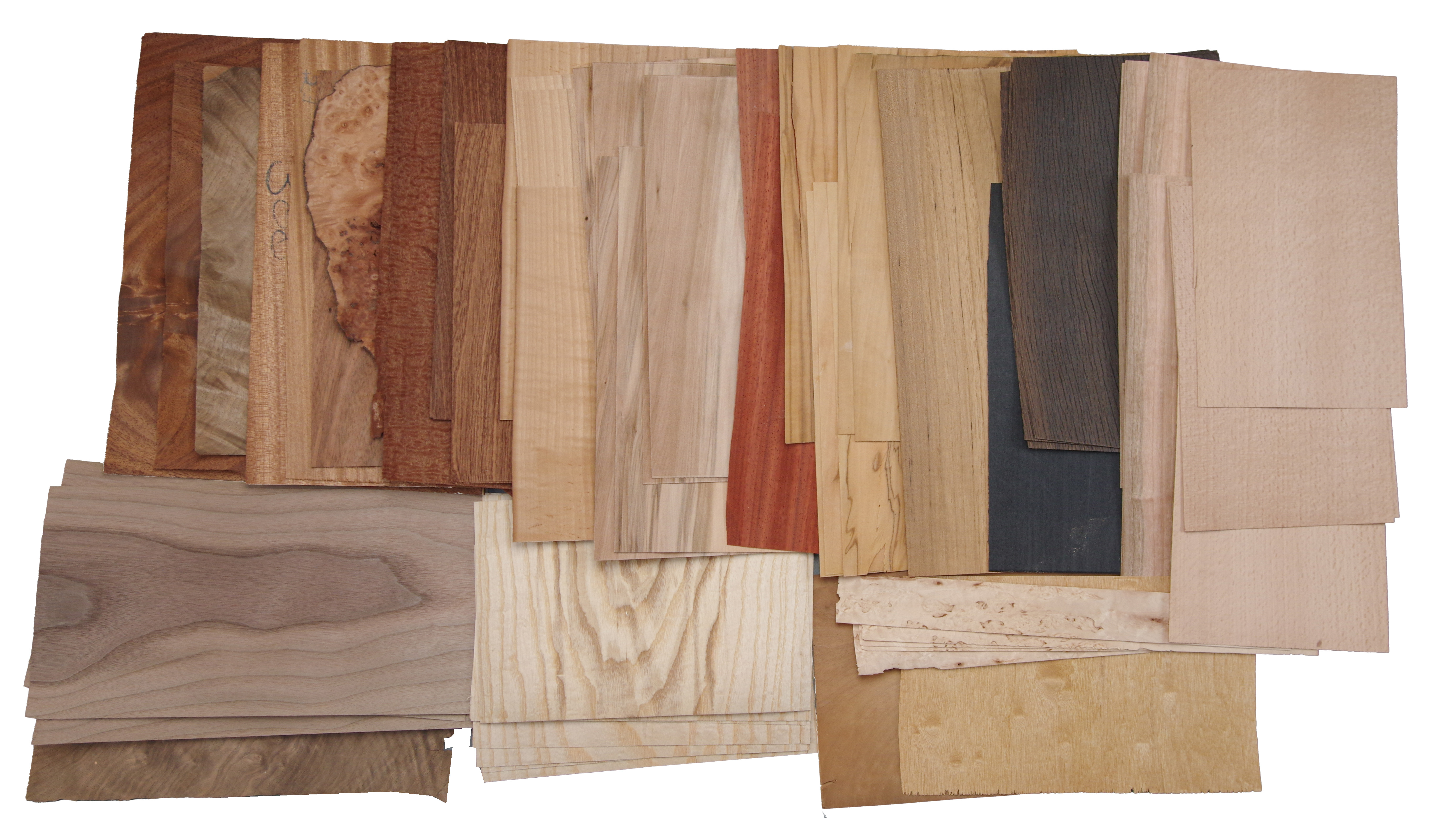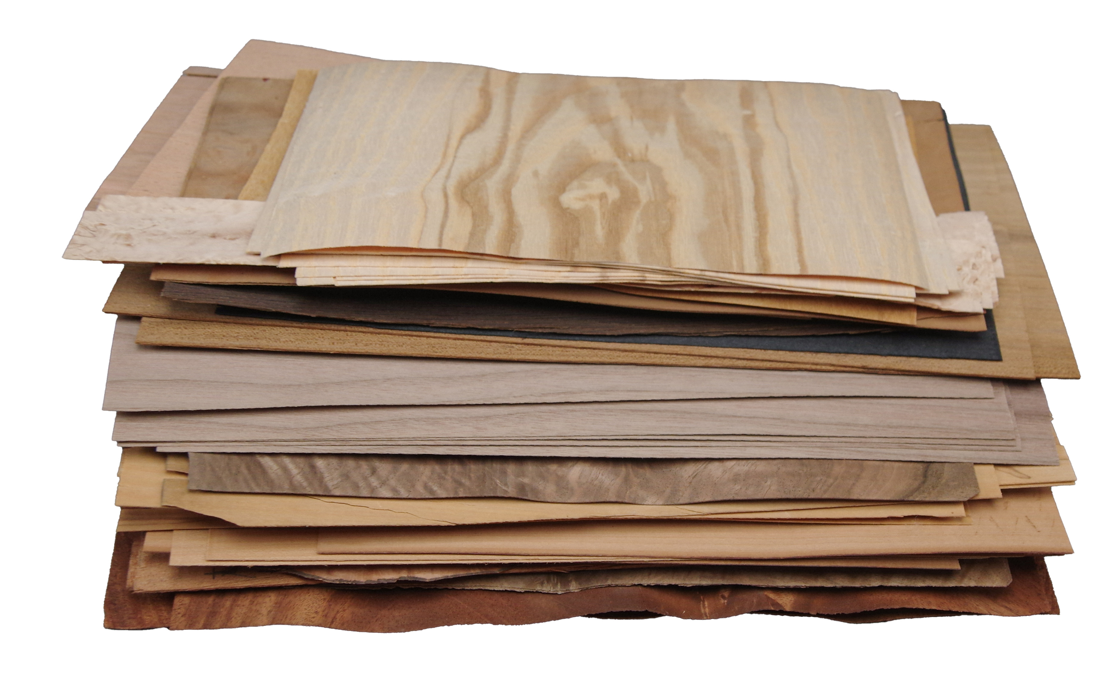 Eine Kiste mit Furnier Einzelblätttern und Abschnitten. Enthält unter anderem: Mahagoni Pyramide, Sapeli, Olive, Teak, Satin, Nussbaum, Etimoé