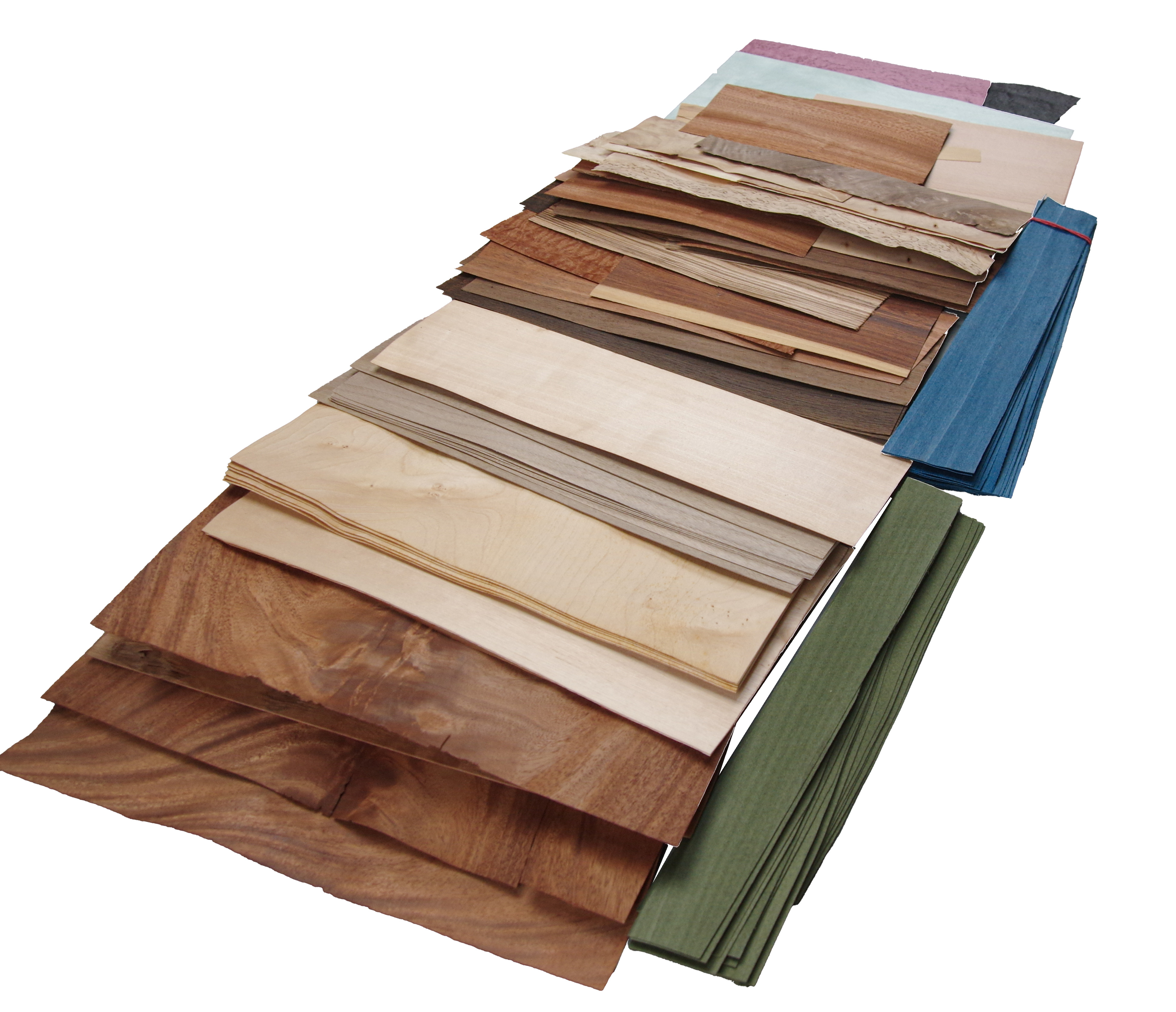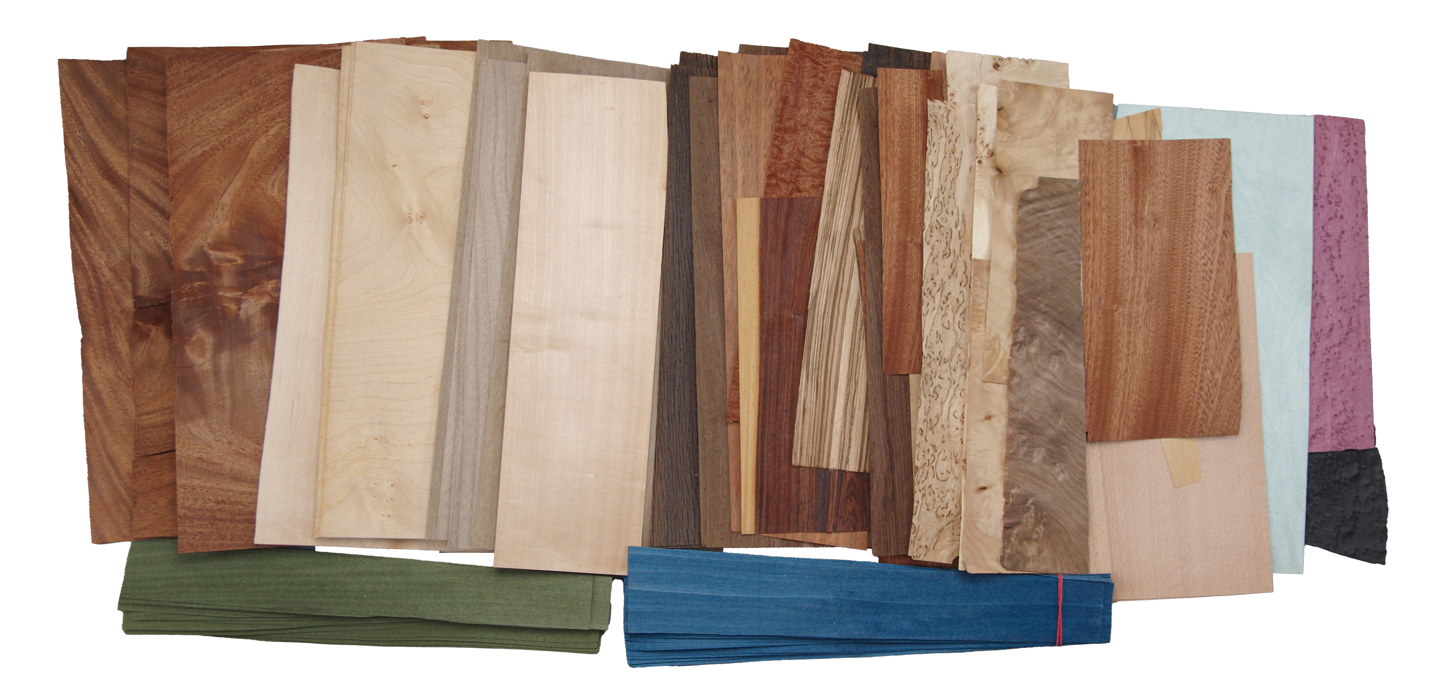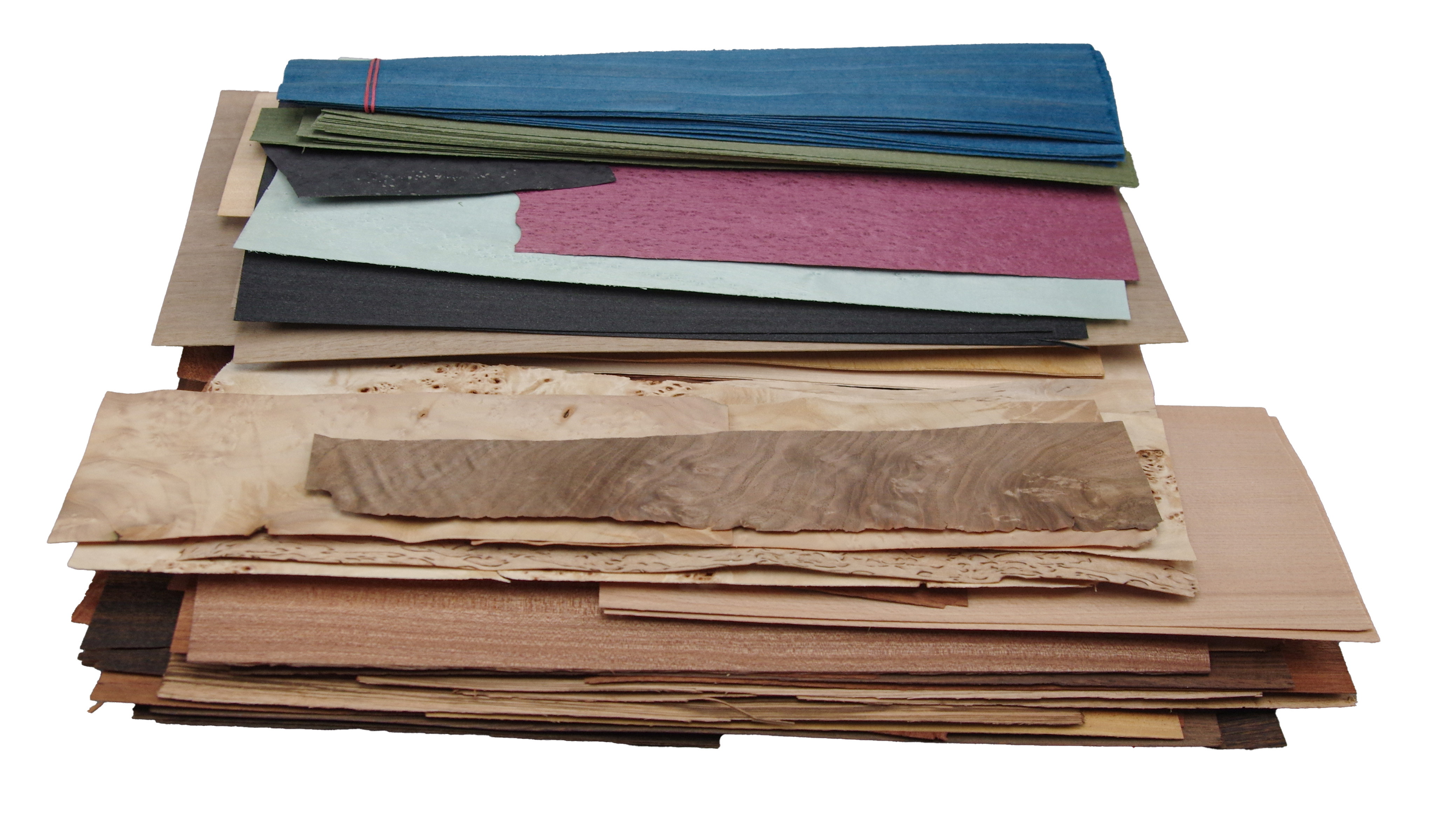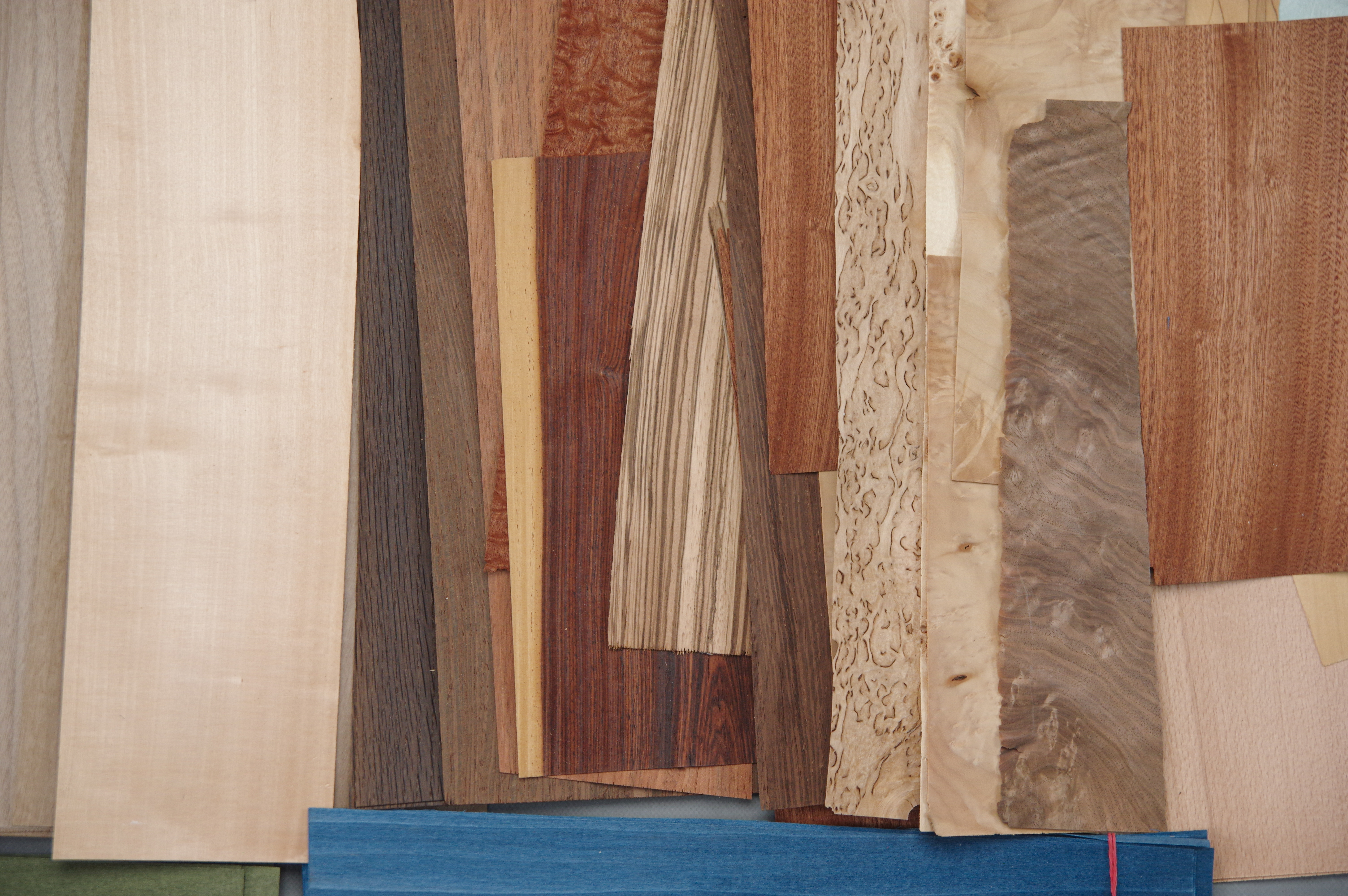 Eine Kiste mit Furnier Einzelblätttern und Abschnitten. Enthält unter anderem: Mahagoni Pyramide, Sapeli, Nussbaum, Zebrano, Flammbirke, Ahorn, gefärbte Furniere